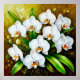 En detaljerad konstverk av livfulla vita orkidéer kompletterade med frodiga gröna blad, visade mot en texturerad gyllenbrun bakgrund, som visar elegansen och skönheten hos blomsterarrangemang.
