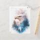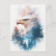 Denna hisnande design visar en majestätisk vit örn i en ädel profilvy, där dess silhuett elegant smälter in i en lugn skogsscen. Skapad som en högkvalitativ digital illustration i en mjuk akvarellstil, har örnen strålande vit fjäderdräkt och en skarp, ljus näbb som förmedlar en känsla av lugn kraft och vaksam vishet. Den nedre halvan av örnens form övergår i en tät lund av teal- och djupblå städsegröna träd, medan en mjuk dimma och lysande ljuskärl driver genom skogsbotten. Ovanför örnen är en varm solnedgångshimmel fylld med mjuka rosa och orange moln, skimrande vita stjärnor och en liten flock fåglar som flyger i fjärran. Den övergripande estetiken är fredfull, mystisk och full av naturlig under, vilket gör den till ett utmärkt val för fågelälskare och fans av dubbelexponerad naturkonst. Detta eleganta örn-postkort är ett perfekt val för att skicka en meningsfull "tänker på dig"-lapp eller en kraftfull hälsning till en vän som finner styrka i naturens vilda skönhet. Du kanske väljer att använda