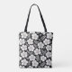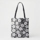 Stora vita blommor med pärlfärgade centra kontrasterar vackert mot en svart bakgrund, omgivna av intrikata ormbunksliknande blad