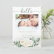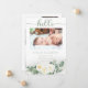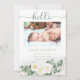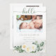 Söt babyflicka vita rosor och eukalyptus blomsterbuketter fyra foto collage dubbelsidig "Hej" Födelse meddelande. Lägg bara till din älskade babys foton och detaljer för att slutföra denna design. Sammansatt design av Holiday Hearts Designs (rättigheter förbehållna).