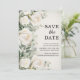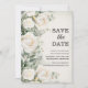 Elegant botanisk, akvarell blomsterbröllop Spara datum med vita rosor och grönska. Detta Spara datum-kort är ett icke-foto-kort. Kontakta mig för hjälp med dina anpassningar eller för att begära ytterligare matchande eller samordnande Zazzle-produkter.