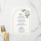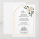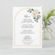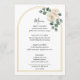Lägg till en elegant avslutande touch på dina receptionsbord med denna vackert designade bröllopsmeny inspirerad av ett vattenfärgtema med vita rosor i trädgård. Designen har ömtåliga vita rosor i kombination med mjuk grönska arrangerade längs en graciös minimal floristisk gyllene bröllopsbåge, vilket skapar en raffinerad botanisk accent som känns romantisk och tidlös. Denna mjuka blommiga komposition speglar en mjuk botanisk romantisk tidlös bröllopsestetik, som ger en känsla av naturlig skönhet och sofistikering till din dukning.
