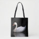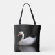 Vit tyst svan som flyter i sjö med reflektion mot svart bakgrund i vatten. Låg nyckel.
