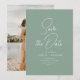 vita typografi sage grön design med stilfull modern bokstav. Våra vackra personliga bröllopskort för att spara datumet har en fantastisk design som kompletterar alla bröllopsteman. Framsidan av kortet har en personlig text tillsammans med en vacker bild.