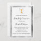 En modern elegant och inbjudan. En vit bakgrund som dekoreras med en schalice och en värd, faux silver ramar. Anpassa och lägg till namn och detaljer. Vit text.