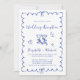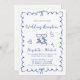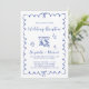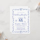 Quirky retro-inspirerad bröllopsinbjudan med en fransk blå vågigt ram med coquette-bögar, visuella hand plockade-illustrationer av ett hjärta, stjärnor och vin-glas och "Bröllopreception" och namn av bruden och brudgummen i ett roligt, lekfullt blått skript.