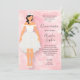 Rosa vattenfärgsbakgrund Quinceañera födelsedagsfest inbjudan med en söt flicka med svart hår med ett modernt, höglågt hingst med en svag silver-snurra mönster över kjolen, en båge vid våten, av skulderbanden, pärlhalsband, vit tiara och vita skor. Perfekt för prinsessans 15-årsdag. Annan hårfärg i vår butik.