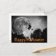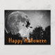 Roligt Halloween-vykortsdesign har svartvit bild av fullt måne med flygande häxsilhuett och övertäckning av anpassadet
