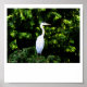 En digital målning av en Underbar blå Heron, målad vit, som står ovanpå träd i ett skog.