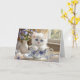 En flytande vit kattunge med påfallande blå ögon kapslas i en blå och vit blommigt tekopp på en bordduk från snöre med glöd- mig- inte blommor som solfilter genom ett fönster. Inre text kan ändras.