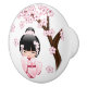 Vektorillustration av en gullig orientalisk flicka i en ljus - den brud- kimonoklänningen för rosor/för vit med en mörk - röd underplagg. Flicka svart hår dekoreras med blommor och geishastilhårnålar. Detta konstverk inspirerades av traditionella kokeshidockor av Japan och påverkades av japansk Chibi Kawaii konststil. När du blommar Sakura det körsbärsröda träd gör en enkel bakgrund.