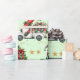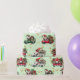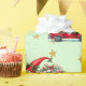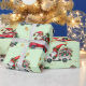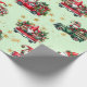 Kvismliknande gnomer med rött, grönt och vit vintage lastbilar med ryggen fyllda med bravader, Julgranar, inslagna gåvor och julklappar. Bakgrund är en grönt i bleken med guld-folie som är sammanflätad överallt.