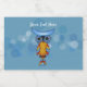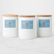 Anpassningsbarna för ett livsmedel i burk har en vit abstrakt uggla med blått huvud, gult och färgade fjädrar och svan på blå botten med cirklar och streck i blå nyans. Anpassa texten med mallen.