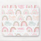 Cute och vismisk pastellregnbåge med mönster-musmatta. Det finns också moln och regndroppar. Girly och modern design.