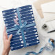 En rolig pildesign i vit på en marinblå bakgrund av klassikern.