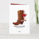 Roligt westernt julhälsningskort i stil, med gammalt pappert utseende och fet anpassningsbar röd text. Bilder av en brun cowboybock dekoreras helt och hållet med en smak av holly och en röd och vit candy cane. Anpassa det här unika helgdag för att läsa vad du vill ha.
