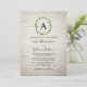 En bröllopsinbjudning med en illustration av en krans av grönten över vit tegelbakgrund med svart text.