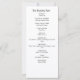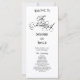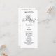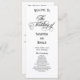 Ett bröllopsprogram som innehåller en elegant vit bakgrund med svart text och svartfärgad calligraphy inslag.