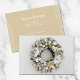 Plattvisitkort har en vacker snö flockad krans av gräs som dekorerats med vita och guld Julgran-prydnadsämnen och blommor på framsidan. Er personlig hälsning och företaget namn trycks på baksidan av guld. Se till att kontrollera din beställning dubblan innan du lägger till den i din kundvagn eftersom det du ser på skärm är vad som skrivs ut. Live Design Service kan hjälpa dig med designlayouten om det behövs.