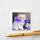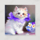 Kort för djurutrymme med en underbar vit kattunge! En flytande kattunge bär en lila blomkrage. En blå skål med vitt och lila blommor sitter vid högerna. En fantastisk gåva till kattälskare och Viktorianska konstentusiaster!