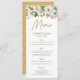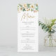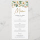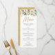 Menykort eller bröllopsprogram för bröllop för att matcha dina inbjudningar till vita och guld-blommigtar. Första till tredje kursen och drycker ingår som du kan anpassa. © Mini Moi-utskrifter