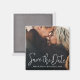 Den här enkla, snyggt moderna fotot-bröllop spara datum-magnetmallen innehåller "Spara datumet" i ett mycket modernt skript med det första namn och datumet på en enda rad nedanför den. Texten är skarp vit. Vi erbjuder också en liknande design i vår butik som omfattar din lokaliseringsort i bröllop, så kontrollera vår butik om du föredrar att inkludera den informationen. Lägg till ditt favoritfoto och dina detaljer för att göra den här chicen till ett bröllop spara datum-magnet som är unikt för dig!