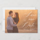 Det här romantiska spara datum magneter har ett fullt- och elegant-skript. Vit, modern kalligrafi lyder "Spara our Date" och täcker över ett foto med fullt- och landskapsorientering. Parets namn, bröllop och bröllop är skrivna i vitt.