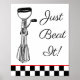 Denna affisch är svart, vit och röd med texten "Just Beat It" och en grafik av en gammal retro-visp med rutig kant.