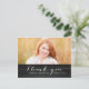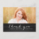 Tack för ditt kort, Trendig White Script Rustic Studenten. Design av Elke Clarke © Besök vår butik www.zazzle.com/monogramgallery* för mer färg och stilar. Lägg till eget foto och egen text. Ett vanligt, handskrivet skript med vit typografi täcker över en svart bakgrund på ritytan (utskriven fotoeffekt) med orden "Tack". Byt ut exempelfotot mot ditt eget.