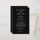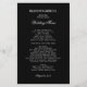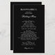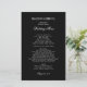 Enkel svart bröllop-meny. Vit utskriven text i modern typsnitt med enkel fyllning av mallavsnitt. Namn överst och bröllop i grund. Lägg till aptiserare, kurser, entréer, öknar osv., som du vill fylla mitten i de pappra. Bulkrabatter gäller. Se den mindre 4 x 5-tumsmenyn nedan.