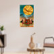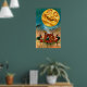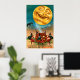 En lustig vintage Halloween poster med en grupp häxor som dansar runt en Jack O'Lantern under det ljusa leende måne.