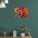 Den här poster har en skarp orange och röda dahlier och lila zinkor som påminner oss om de branta sommardagarna med blommor som brinner med färg.