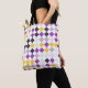 Den här bilden har en upprepande geometrisk mönster som består av färgfulla diamantformer i ett rutnät. Diamanterna växlar mellan stark gult, djup lila, lavender och mörk grått, separerade med vita blanksteg, skapar en levande och balanserad arrangemang påminnelse om både klassiska glasögon och lekfulla pussel. Färg är jämnt fördelat, vilket ger en slående och modern visuell effekt.