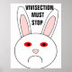 Den här poster har ledsen ansikte på en vit kanin. Den här kaninen har en stor frossa på ansikte eftersom det är en labbkanin som har testat kosmetika på den. Ögonens vita är röda och svullna. Utformningen har skapats för att uppmärksamma det onödiga lidande som testningen av kosmetika på djur orsakar. Den fet, svarta texten mellan kaninens öron säger "vivisektionen måste upphöra". Poster finns i flera olika storlekar, varav den största visas här. Lägg upp den hemma eller på jobbet och stödja animaliska höger.