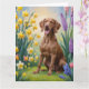 En glad hund sitter fredligt på lush grönt gräs, omgiven av färgfulla vår blommar under ett mjukt blå himmel. Den här digitala oljemålningen fångar upp ett ögonblick med uttryckliga penseldrag, varmt färg och en känsla av varm glädje.