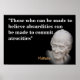 "De som kan fås att tro att absurditeter kan fås att begå illdåd", Voltaire citerar. Många absurditeter flyger runt i media nuförtiden, köper någon dem? Det är förmodligen värt en tänka.