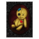 Skrämmande men söt voodoo lumpdocka gjord av säckväv, med en lapp på huvudet, en knapp för ögat och en ledsen sömmad mun. En röd hjärtformad lapp på bröstet har två nålar fast. Bakgrunden är en effekt av flagnande färg.