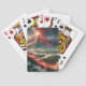 Ett stort vulkaniskt utbrott dominerar scenen, med vibrant rött lava som flödar ner i sluttningarna och en mängd rök som väller in i himmel. Det omgivande landskapet är smutsigt och kontrasterar mot det eländiga utbrottet.
