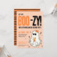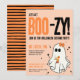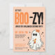Boo-zy Cocktail Spök Kostym Fest Halloween Inbjudan. Fira med några bu och sprit! Välkommen gäster till en Halloween kostymfest med denna roliga festinbjudan. En rolig och söt spöktteckning med 'Let's Get BOO-zy' och en Halloween-temat drink i dess 'händer'. Drycken har också en liten jack-o-lantern i sig. Det söta spöket har en orange rosett på huvudet för att matcha drinken, men du kan också antingen gömma rosetten helt (bara tryck på 'ögon'-ikonen när du håller muspekaren över elementet i redigeraren), eller så kan du ändra rosettens färger. Söta stjärnor runt spöket som accent. Fet typografi i orange och svart. På baksidan finns roliga r
