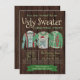 Våldsfull julfestinbjudan med tre fula tröjor på en rustik träbakgrund. Du kan enkelt anpassa dessa inbjudningar till din fest för den fula roligten genom att helt enkelt lägga till dina uppgifter.