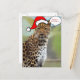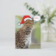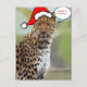 Färgrika julvykort som du kan överföra någonstans. En leopard som ha på sig en jultomtenhatt, poserar med en suddig bakgrund. "Säsong är hälsningar" skriftliga i rött skrivar i ett tal bubblar kommande från leopardmunnen.