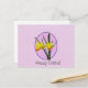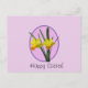 Gult- daffodils bildas framför ovala "fönster" med lila trim. Bakgrund i ljuslavender, insida i en mörkare skugga. Texten under texten lyder "Glad påsk!" och kan anpassas.