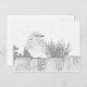 Black Phoebe sitta på trästängslet. Bakgrunden till träd och himmel med moln som skisserats dåligt. Färg med pennor, bläck, färg eller ...