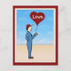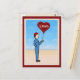 En glad, enkelt urtagen beställare i blå förklädnad och ett rött lock ger kärlek gåva i form av en stor, röd, hjärtformad ballong på detta vykort. Han står på en öppen slinga framför en fullt av moln i blå himmel. Anpassadet på hjärtat kan lätt ändras till spelar ingen roll. Från min ursprungliga digitalt skapat blandade mediefavbildning. com