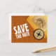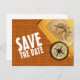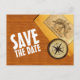 Postkort för äventyr Bröllop spara datum med en antika kompass, en stegosaurus dinosaur-informationsskylt för skelettet på en biet av pappra och en träbakgrund som ser digital ut. Den här coolan sparar tidskvittot som perfekt för arkeologi, äventyr eller museientusiastpar. Enkel att anpassa, lägg bara till information om bröllop. Klicka på Anpassa om du vill söka efter fler anpassningsalternativ.