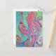 Söt bläckfiskvykort med roligt rosa lila bläckfisk på tallriken med ett vänligt leende av tecknad