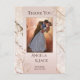 Ett romantiskt vykort med ett eget favoritfoto från bröllop som är framtaget av en blommigt från ro guld på en marmorbakgrund med ljusgnistor.