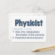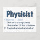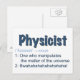 Fysikarna är smarta. De kan också vara lite farliga. Minneshögtid med detta vykort som definierar yrket utifrån vad de kan göra (manipulera saker) och vad de ska se efter (ondskefullt skratt).