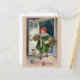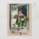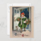 Designad av Susan Epps Oliver. Vintage-julbild av en liten flicka som återvänder hem med holly boughs och julpost. En upphetsad liten hund är vid hennes sida.