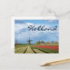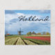 Ett landskapskort med kvarn och gult och röda tulpaner under ett grumligt himmel på den nederländska landsbygden en vacker vårtid i Bulbregionen, Nederländerna med texten "Holland".